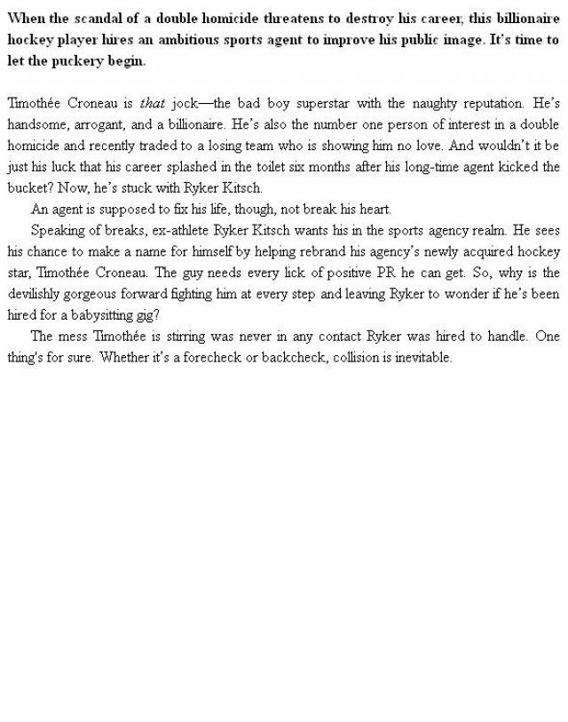 When the scandal of a double homicide threatens to destroy his career, this billionaire hockey player hires an ambitious sports agent to improve his public image. It's time to let the puckery begin. Timothée Croneau is that jock—the bad boy superstar with the naughty reputation. He's handsome, arrogant, and a billionaire. He's also the number one person-of-interest in a double homicide and recently traded to a losing team who is showing him no love. And wouldn't it be just his luck that his career splashed in the toilet six months after his long-time agent kicked the bucket? Now, he's stuck with Ryker Kitsch. An agent is supposed to fix his life, though, not break his heart. Speaking of breaks, ex-athlete Ryker Kitsch wants his in the sports agency realm. He sees his chance to make a name for himself by helping rebrand his agency's newly acquired hockey star, Timothée Croneau. The guy needs every...