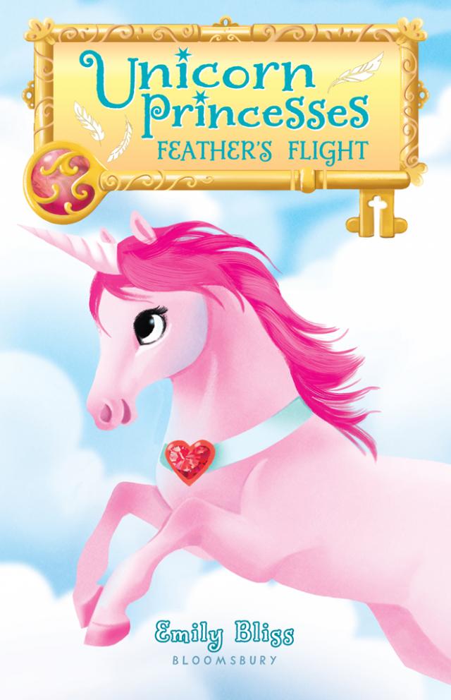 She opened her bureau drawer and chose a bright pink shirt with glittery silver and white feathers printed all over it. She pulled off her T-shirt and tossed it in the hamper. As she tugged her pink shirt over her head, she heard a high, tinkling noise. Cressida’s heart raced as she pushed her arms through the sleeves. She leaped over to her bedside table, opened the drawer, and wrapped her fingers around an old-fashioned key with a crystal-ball handle that was glowing bright pink. The key had been a gift from her friends, the unicorn princesses. Whenever they wanted to invite her to visit them in their magical world, the Rainbow Realm, they made the key’s handle glow and pulse.